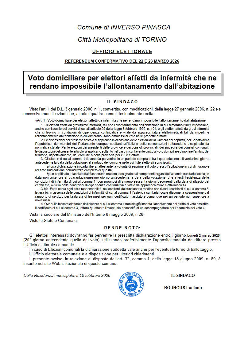 Referendum del 22 e 23 marzo 2026 - Voto domiciliare per elettori affetti da infermità che ne rendano impossibile l’allontanamento dall’abitazione
